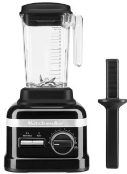 KitchenAid Standmixer High Performance in onyx schwarz. Zerkleinert und vermischt auch harte Zutaten, gefrorenes Obst und fasrige Gemüsesorten und sieht obendrein sehr stylish aus. Mit 9 Geschwindigkeitsstufen und Stampfer.